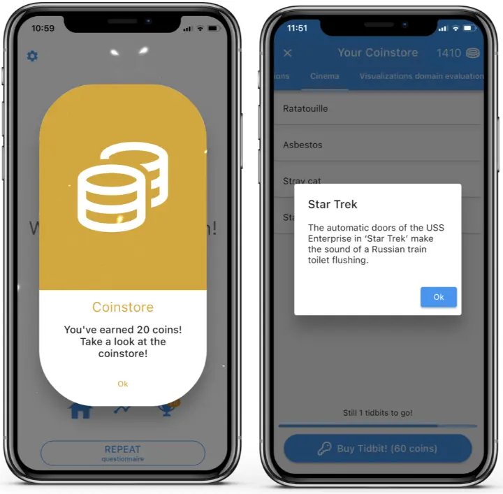 - Gamification group: Immediately received in-app virtual coins plus fireworks 🎉. They could save these coins or spend them on fun facts (extrinsic rewards) or personalized graphs (intrinsic rewards).